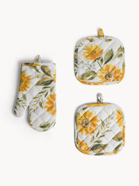 Set of 3 - 2 pot holders and 1 kitchen glove Cotton panama sunflower print - S/3 / #N/A