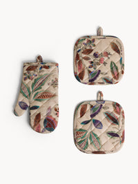 Set of 3 - 2 pot holders and 1 kitchen glove in cotton Panama flower print - S/3 / #N/A