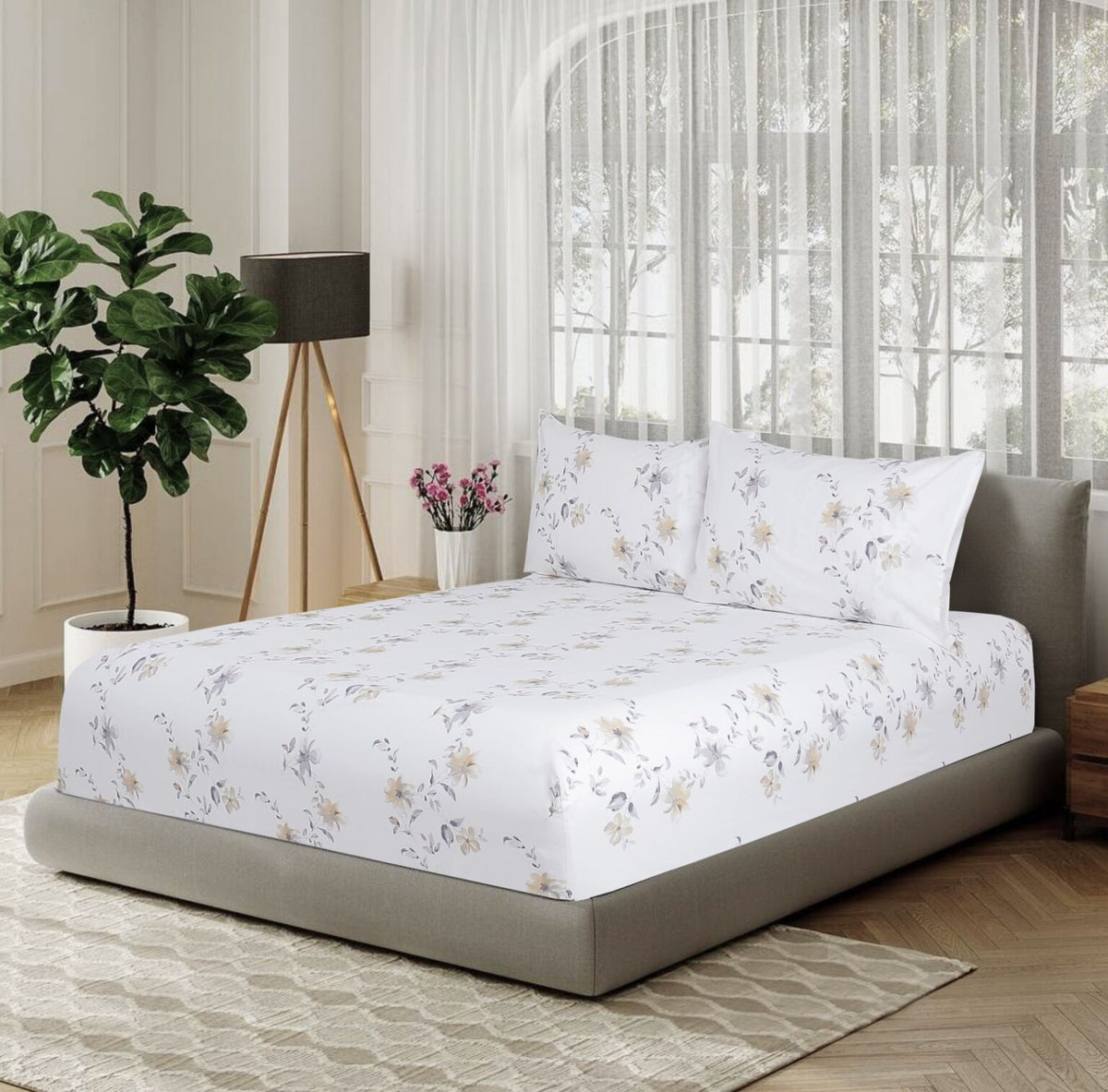 Sleep in comfort and style with our 200 thread count (TC) printed fitted sheet set, crafted from 100% pure cotton for a soft and breathable feel. The set includes a fitted sheet with a vibrant, long-lasting print and matching pillowcases, ensuring a perfect blend of style and functionality. Pair it with our matching duvet cover or comforter for a complete, coordinated look.