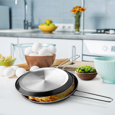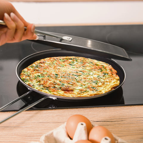 • Double pan system with interlocking lock: easily rotate omelettes, frittatas and crepes without spills or a mess on the hob.